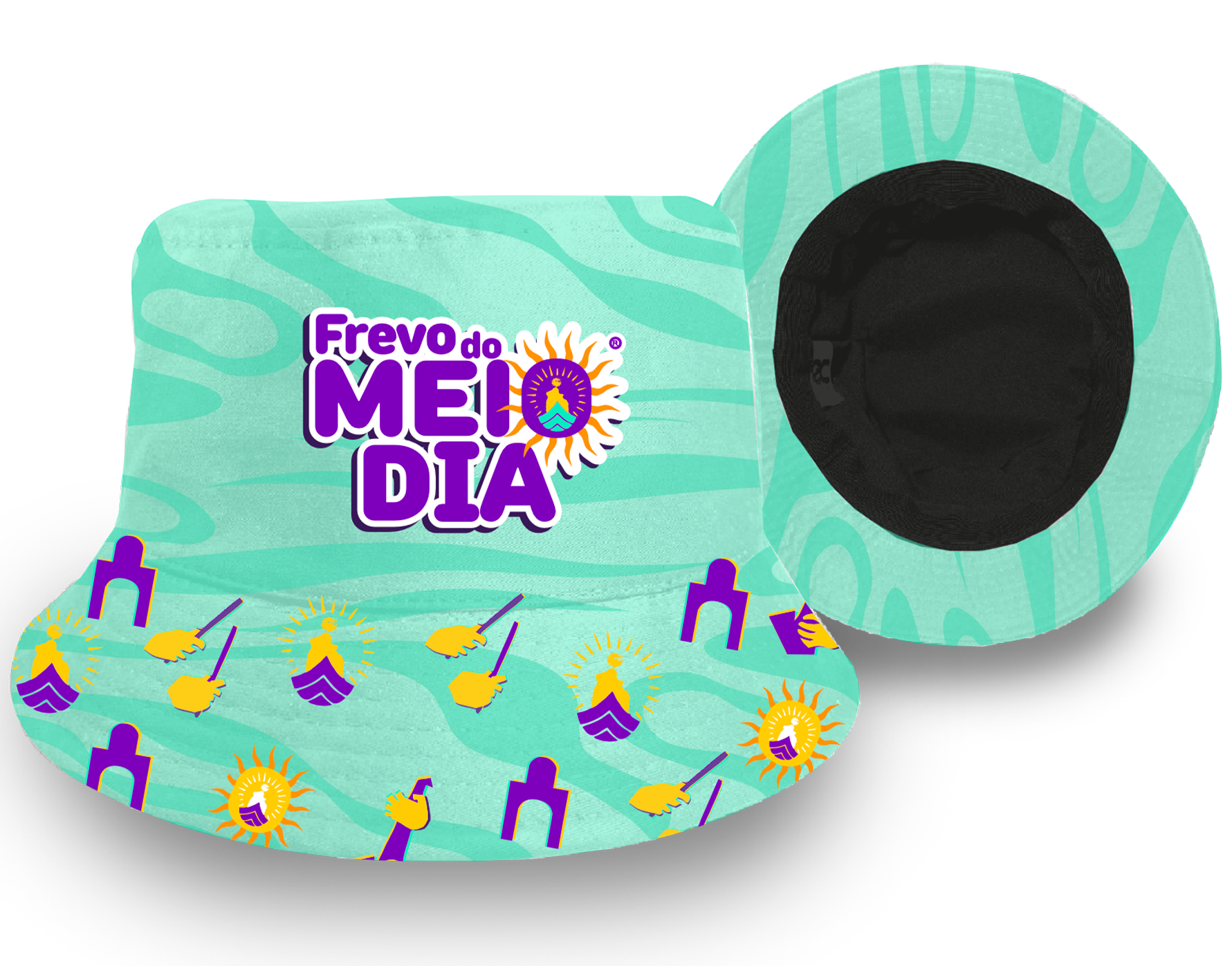Este Bucket Hat é a sua peça essencial para o verão e para o Carnaval. Com uma estampa full print em verde-água e elementos do frevo e do sol, ele captura a alegria e a energia contagiante do bloco Frevo do Meio Dia. É um acessório confortável, com ventilação e feito para resistir à folia.