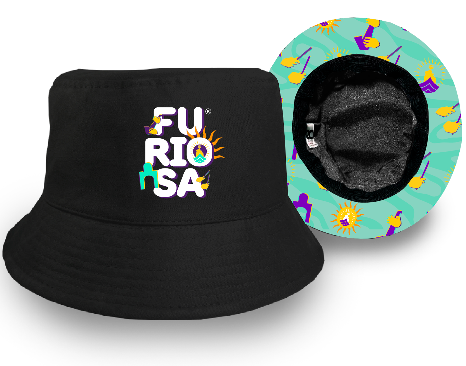 Perfeito para os dias de sol e para festivais. Este Bucket Hat é versátil, combinando o preto clássico (frente) com um forro interno que revela a arte vibrante da ACAF. A logo FURIOSA em neon no painel preto é um toque de atitude. Use-o para proteger-se do sol ou como uma peça de streetwear única.